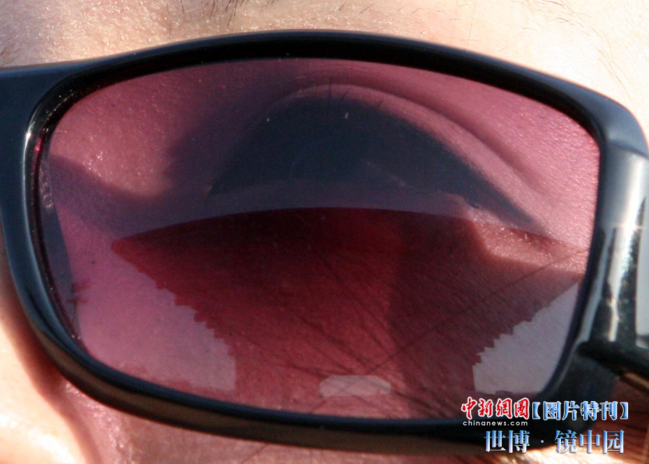 世博園開園3天,天氣一直晴熱,不少游客帶起墨鏡來遮擋刺目的陽光,從鏡片的折射中看世博園,別有一番趣味。中新社記者 湯彥俊攝