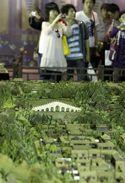 5月4日,游客在參觀縮微版“圓明園”。近日,一座“全景式巨型立雕圓明園”在上海世博會世界貿(mào)易中心協(xié)會館亮相。這座縮微版的“圓明園”以1比150的比例制作而成,再現(xiàn)了全盛時期的圓明園雄偉壯觀的全景。圖片來源:新華網(wǎng) 裴鑫 攝