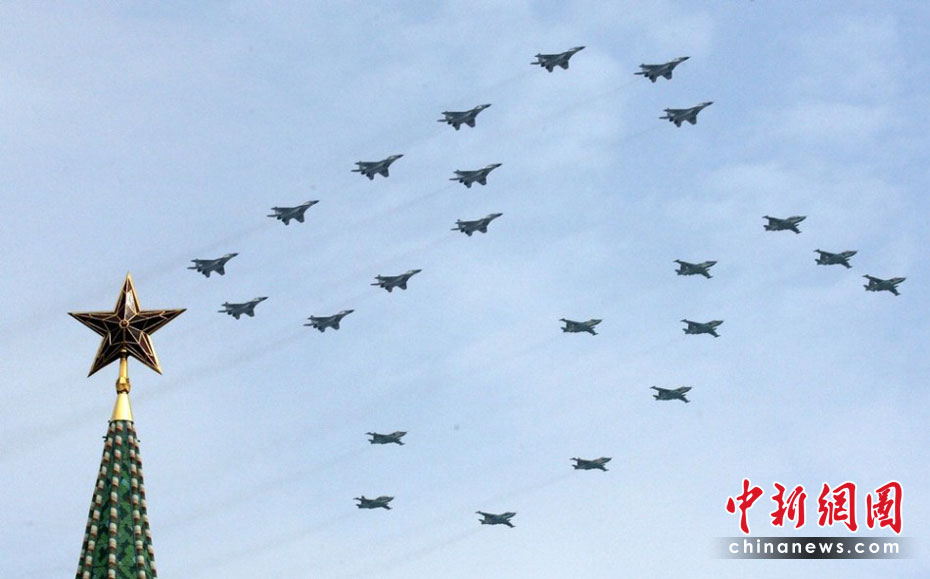 當(dāng)?shù)貢r(shí)間5月4日,在俄羅斯首都莫斯科,參加彩排的戰(zhàn)機(jī)編隊(duì)飛過紅場上空。俄羅斯將于5月9日隆重紀(jì)念衛(wèi)國戰(zhàn)爭勝利65周年。圖片來源:中國新聞網(wǎng)