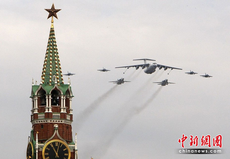 當(dāng)?shù)貢r間5月4日,在俄羅斯首都莫斯科,參加彩排的戰(zhàn)機(jī)編隊飛過紅場上空。俄羅斯將于5月9日隆重紀(jì)念衛(wèi)國戰(zhàn)爭勝利65周年。圖片來源:中國新聞網(wǎng)