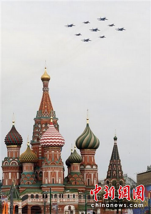 當(dāng)?shù)貢r(shí)間5月4日,在俄羅斯首都莫斯科,參加彩排的戰(zhàn)機(jī)編隊(duì)飛過紅場上空。俄羅斯將于5月9日隆重紀(jì)念衛(wèi)國戰(zhàn)爭勝利65周年。圖片來源:中國新聞網(wǎng)