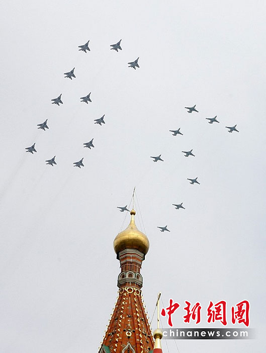 當(dāng)?shù)貢r間5月4日,在俄羅斯首都莫斯科,參加彩排的戰(zhàn)機(jī)編隊飛過紅場上空。俄羅斯將于5月9日隆重紀(jì)念衛(wèi)國戰(zhàn)爭勝利65周年。圖片來源:中國新聞網(wǎng)
