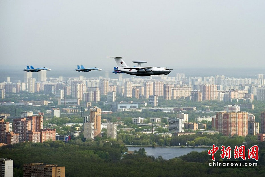 當(dāng)?shù)貢r(shí)間5月4日,在俄羅斯首都莫斯科,參加彩排的戰(zhàn)機(jī)編隊(duì)飛過(guò)紅場(chǎng)上空。俄羅斯將于5月9日隆重紀(jì)念衛(wèi)國(guó)戰(zhàn)爭(zhēng)勝利65周年。圖片來(lái)源:中國(guó)新聞網(wǎng)