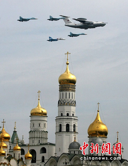 當?shù)貢r間5月4日,在俄羅斯首都莫斯科,參加彩排的戰(zhàn)機編隊飛過紅場上空。俄羅斯將于5月9日隆重紀念衛(wèi)國戰(zhàn)爭勝利65周年。圖片來源:中國新聞網(wǎng)