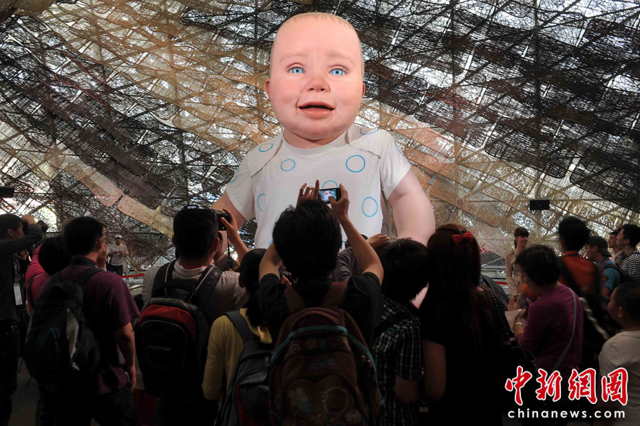 圖為西班牙館內的巨型寶寶。 中新社記者 陳文 攝