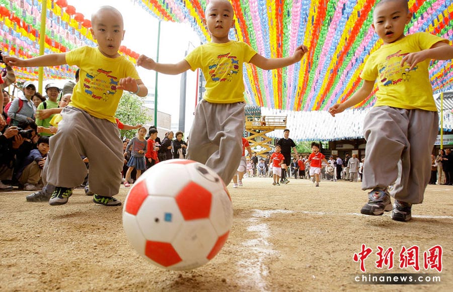 2010年5月15日,韓國首爾曹溪寺院舉行了兒童足球賽,一群四五歲的孩子和小和尚參加了這場足球友誼賽。這場比賽是佛誕節(jié)活動的一部分,也是為了迎接2010世界杯足球賽的到來。Chung Sung-Jun