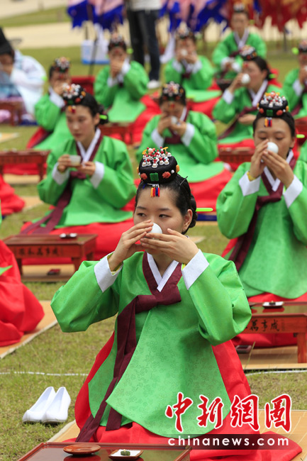 5月17日,韓國(guó)首都首爾慶熙宮舉行了第38屆成人禮儀式。為了慶祝青年人年滿20歲,同時(shí)也為了提高他們身為成人的責(zé)任感。圖為韓國(guó)少女在成人儀式上喝酒。圖片來源:中國(guó)新聞網(wǎng)