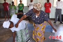 5月初,游客在上海世博會新西蘭館前赤膊上陣學跳毛利舞。中新社記者 杜洋 攝