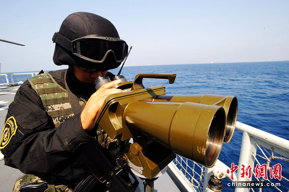 特戰(zhàn)隊(duì)員使用高倍望遠(yuǎn)鏡觀察瞭望。江山 攝
