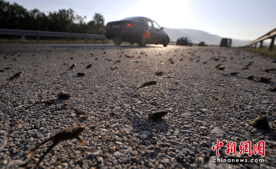 26日,希臘東北部地區(qū)的一條高速公路遭數(shù)百萬只青蛙“占據(jù)”而被迫關閉了兩個小時。圖片來源:中國新聞網(wǎng)>>點擊觀看詳細內容
