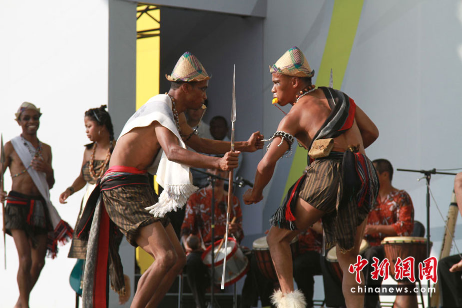 5月30日,馬達(dá)加斯加肯特思米諾歌舞團(tuán)在世博園非洲廣場(chǎng)表演比洛傳統(tǒng)儀式,逼真的神態(tài)、激情的表演,博得許多參觀(guān)者稱(chēng)贊。當(dāng)天是馬達(dá)加斯加館日,世博中心內(nèi)舉行了其國(guó)家館日活動(dòng),馬方和中方代表共同出席。中新社記者 殷春永 攝