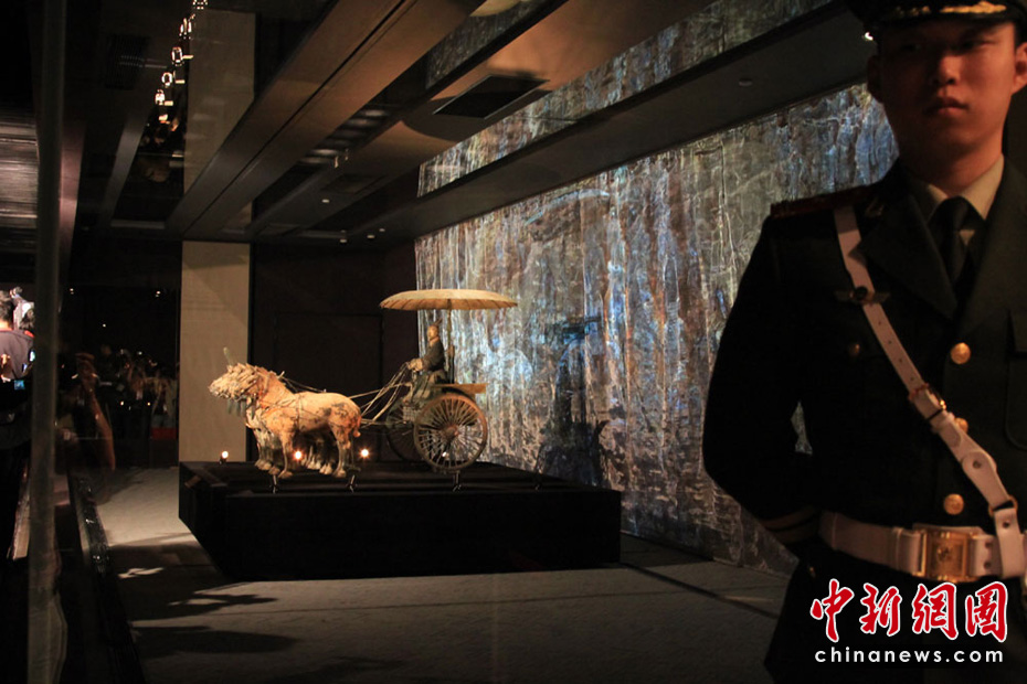 6月1日,秦始皇帝陵出土的“一號銅車馬”亮相世博會中國國家館,這是它出土30年以來第一次“駛出”陜西。這件國寶級文物在地下歷經(jīng)了2200多個春秋,于1980年出土,通體彩繪,為雙輪,單轅,駟馬系駕,總重約1061公斤。銅車馬共由3500多個零件組成,除一些金、銀飾件外,其余全部為青銅鑄件。中新社記者 殷春永 攝