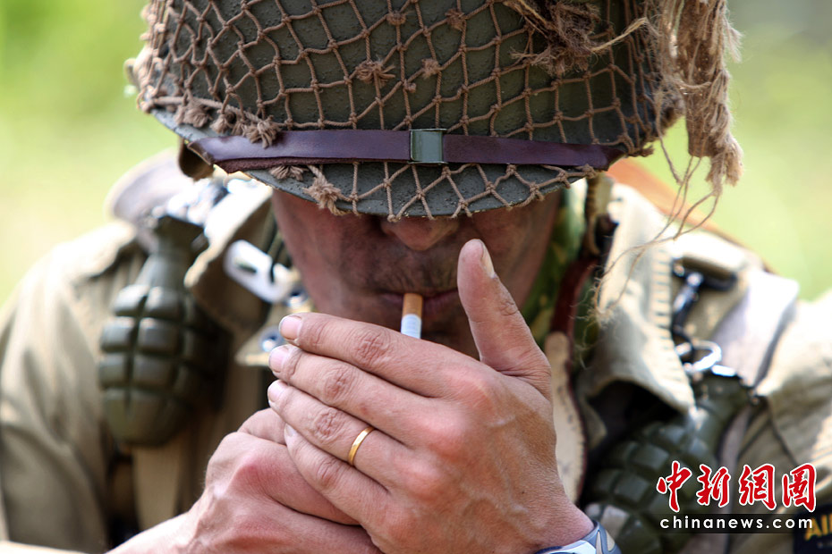 6月5日,諾曼底登陸66周年前夕,一批演員身著二戰(zhàn)時(shí)期美軍軍服,在法國諾曼底卡倫坦重現(xiàn)了這次著名的戰(zhàn)役。