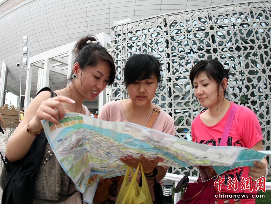 截至6月5日19點(diǎn)30分,上海世博會累計(jì)參觀者已超過1000萬人次。據(jù)悉,上海世博會的規(guī)劃用地為5.28平方公里,約242個(gè)國家和國際組織參展分布在浦東和浦西兩大區(qū)域。要想在這么大的地方找到自己想去的地方,那么世博地圖就是必須的裝備。圖為上海世博園內(nèi)游客正在地圖上尋找自己要去的地方。中新社記者 杜洋 攝
