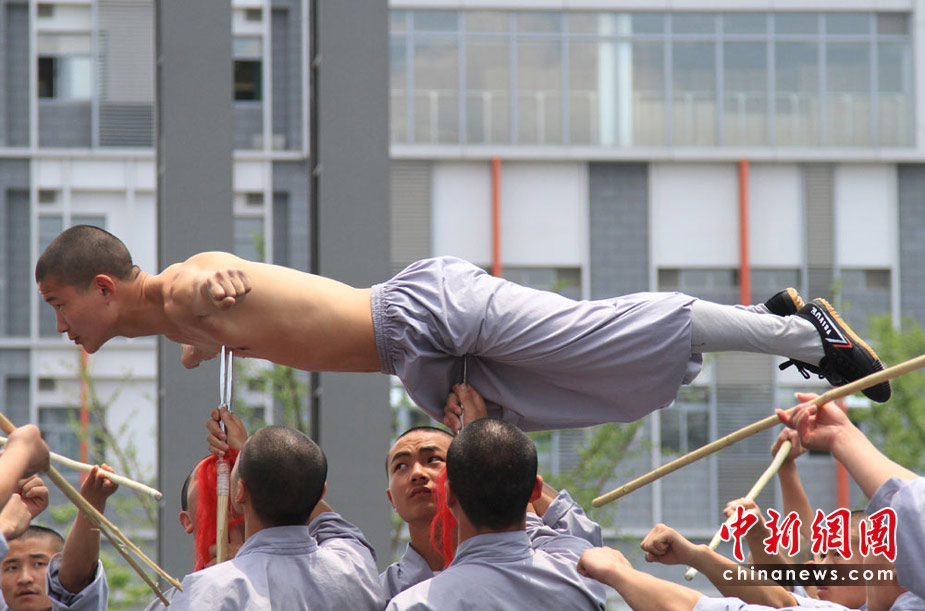 自5月1日開始,上海世博園D片區(qū)綜藝廣場每天都有少林寺功夫展演,受到世博參觀者的熱捧。中新社記者 殷春永攝