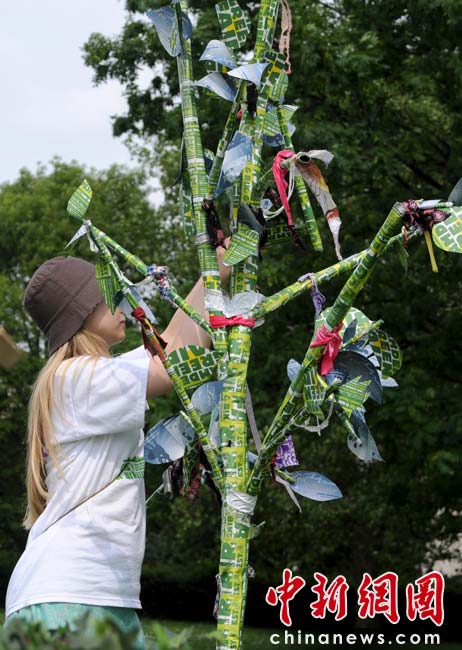 當(dāng)?shù)貢r(shí)間2010年6月6日,英國倫敦舉行卡姆登綠色市集(Camden Green Fair),這是英國倫敦每年環(huán)保領(lǐng)域的“重頭戲”。本屆市集的主旨是要喚起大眾對(duì)環(huán)境問題的關(guān)注,選擇更加可持續(xù)發(fā)展的生活方式。據(jù)活動(dòng)主辦方預(yù)計(jì),本屆市集將吸引來自英國各地和世界各國的2萬多人參加。圖為用回收的廢舊紙張制作的“小樹”。該樹由年輕的倫敦園藝設(shè)計(jì)師Sarah Veniard設(shè)計(jì)。她的設(shè)計(jì)理念是“美麗的可持續(xù)空間”。她認(rèn)為只要有充足的陽光,陽臺(tái)也可以變成一個(gè)集水果蔬菜和觀賞植物于一身的多功能花園。Sarah是純素食主義者,她結(jié)合顧客要求設(shè)計(jì)的瓜果園非常受歡迎。Fiona/攝 Fiona 馬小剛/文