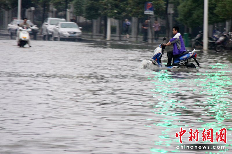 6月8日,在江西瑞昌市街頭,行人在積水中艱難前行。自6月7日夜間開始,江西九江市持續(xù)遭受暴雨襲擊,各縣、區(qū)24小時(shí)的平均降雨量在80毫米左右,最大降雨量在廬山區(qū)達(dá)到134毫米。魏東升 胡國林/CFP
