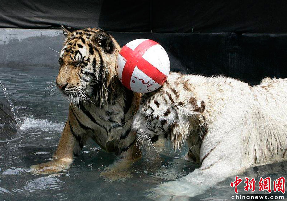 2010年6月7日,美國南卡羅來納州美特爾海灘,在世界杯即將開幕之際,一歲的小白虎Sundaram和孟加拉虎Mukti率先在水里上演了一出足球大戲。英格蘭隊首戰(zhàn)將對陣美國隊,因此足球外側也被印上了英格蘭旗的標志。cfp