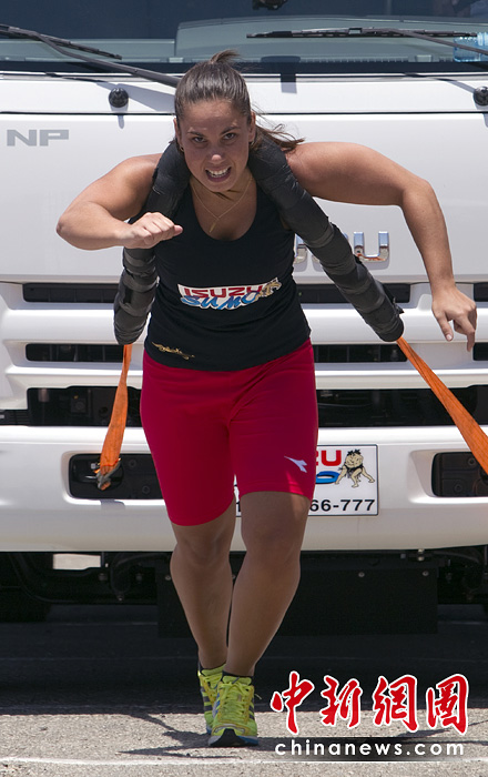 6月8日,以色列在海濱城市特拉維夫舉行了拉卡車大賽。比賽要求將一臺7.5噸的卡車拉到30米以外,用時最短者為勝者。該項賽事不但吸引了世界上眾多男性大力士,更有許多女性大力士出戰(zhàn)。圖片來源:中國新聞網(wǎng)