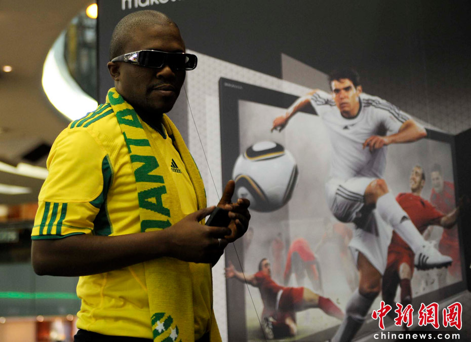 當(dāng)?shù)貢r(shí)間6月9日,一位南非民眾在約翰內(nèi)斯堡的一家商場(chǎng)里體驗(yàn)3D電視觀看足球比賽。中新社發(fā) 廖攀 攝