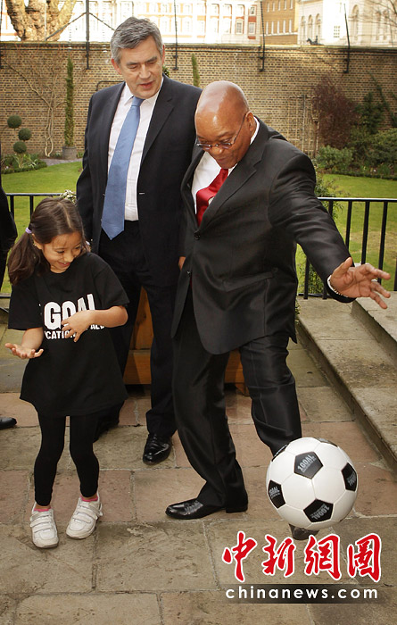 圖為2010年3月4日,英國倫敦,正在英國訪問的南非總統(tǒng)祖馬在唐寧街10號與英國首相布朗舉行會晤,其間還在露臺上跟小學(xué)生玩起了足球。今年世界杯將于6月在南非舉行。
