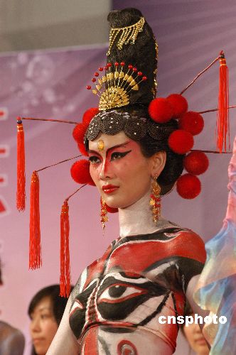 2007年11月3日,第九屆江蘇省美容美甲大賽在南京國(guó)際展覽中心舉行,參賽選手們用中國(guó)紅、京劇服飾等裝扮模特,使自己的作品在傳統(tǒng)文化和現(xiàn)代元素中相得益彰,成為大賽上十分靚麗的景致。中新社發(fā) 阿董 攝