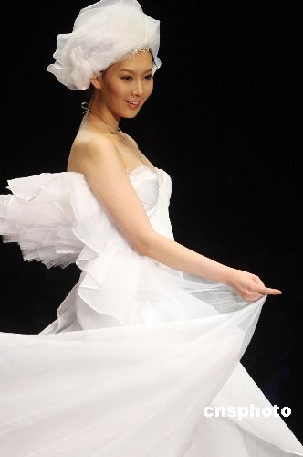 11月7日,“名瑞杯”2008中國婚紗設計大賽在北京中國國際時裝周上舉行,共有來自中國14個地區(qū)的25份稿件入圍了最后的決賽。參賽作品類型設計多樣化,有顏色和造型都很獨特的禮服,也有哥特式風格的新娘裝等,作品設計大膽新穎,使用夸張的造型,同時運用以點堆積成面的裝飾手法,在裙身上做出圖案或者肌理,來豐富服裝的整體內容。現(xiàn)在的婚紗已經不是婚禮的附屬品,而是慢慢的成為時尚亮點,新娘通過選擇婚紗來體現(xiàn)自己的個性和心情,婚紗成為一種特殊的媒介。圖為模特展示婚紗設計大賽作品。中新社發(fā) 錢興強 攝