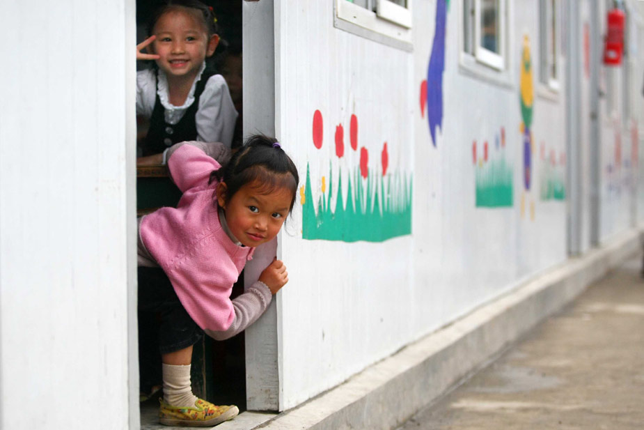 5月11日,小學生在板房搭建的學校里嬉戲。四川省綿陽市安縣在去年大地震中受災嚴重,目前全縣規(guī)劃恢復重建學校49所,包括高中、職業(yè)中學、初中、小學等,規(guī)劃總建筑面積38萬多平方米。中新社發(fā) 富田 攝
