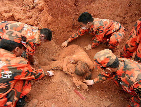 2008年8月30日16時(shí)30分,四川攀枝花市、會(huì)理縣交界處發(fā)生6.1級(jí)地震,造成36人死亡,675人受傷。圖為消防官兵在倒塌的土墻下刨出兩名罹難者的遺體。作者:鄒森 中國(guó)