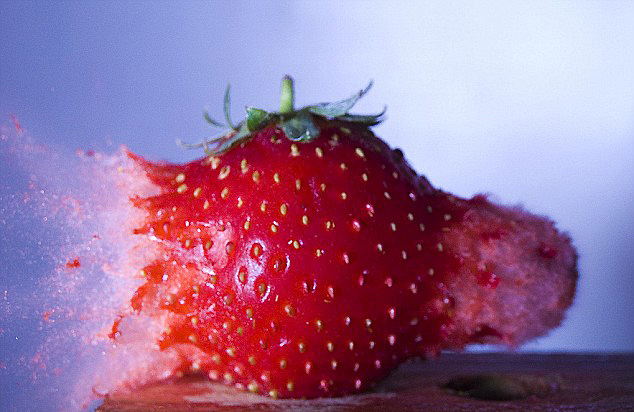 中新網3月26日電 據英國媒體報道,藝術家阿蘭塞勒(Alan Sailer)使用氣槍、相機以及電腦軟件,為我們呈現了以152.4米/秒飛行的子彈橫穿過草莓等物品的瞬間所帶來的視覺沖擊。
