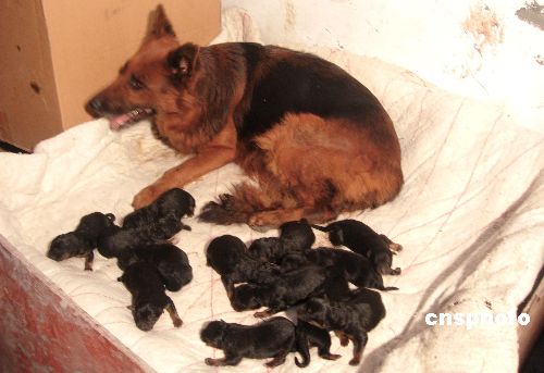浙江臺州雅特銅業(yè)有限公司的一只護(hù)廠狼狗,12月15日中午12點(diǎn)左右,開始產(chǎn)崽,傍晚5點(diǎn)半產(chǎn)下第6只,直到第二天凌晨共產(chǎn)下14只狗崽。據(jù)獸醫(yī)介紹,一般情況下,狗一窩可產(chǎn)3只狗崽左右,一窩產(chǎn)5只的被稱作“五更狗”,一窩產(chǎn)10只狗崽的已不常見,而產(chǎn)下14只就更為稀奇。中新社發(fā) 吳達(dá)夫 攝