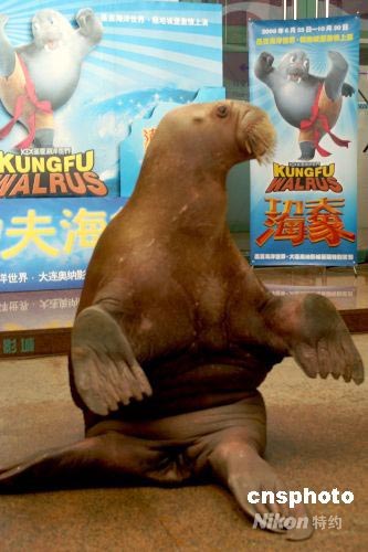6月22日,大連圣亞海洋世界的一頭名為葛拉薩的功夫奇才海象,正在表演“鐵沙掌”。當(dāng)日是電影《功夫熊貓》在大連首映,這位特殊的“中國熱血功夫迷”——圣亞海象,在現(xiàn)場擺起中國功夫陣,PK剛剛上映的《功夫熊貓》。由于海象的到來,現(xiàn)場被圍得水泄不通。中新社發(fā) 宋太盛 攝