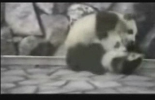 記者向圍墻下望去,水泥地上,兩只胖乎乎的大熊貓扭打在一起,其激烈程度,大有一山不容二“貓”之勢。一只個頭稍大的熊貓,一直不占上風,被體型稍小者幾下就撲倒在地,差一點翻落到旁邊的深溝里。兩只大熊貓手腳并用,你翻我滾抱成一團,讓人看不清頭在哪兒,腳在哪兒。打到激烈之處,一只大熊貓還立起前肢向對方撲去,把對方后背上的皮毛揪起老高。