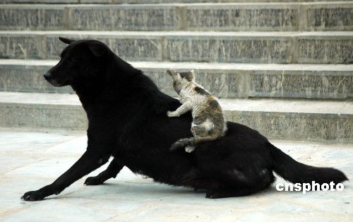 11月16日,一只小貓趴在黑狗的背上。安徽巢湖市居巢區(qū)散兵鎮(zhèn)凌山村一農(nóng)戶家里養(yǎng)著一只花貓和兩條狗。據(jù)主人介紹,小花貓因還在喝奶的時候,貓媽媽就病死了,營養(yǎng)不良,所以已經(jīng)一歲多的小花貓長得很瘦弱,兩條狗卻像貓媽媽那樣愛護著它,小花貓有時很頑皮,騎在狗背上玩耍,構(gòu)成一幅貓狗一家親令人感動的圖畫。中新社發(fā) 徐振華 攝