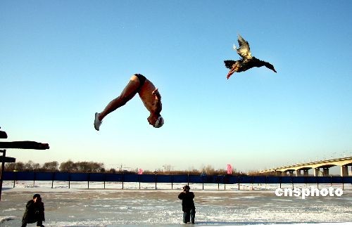 12月10日,在松花江上,黑龍江省冬泳協(xié)會新開設的冬泳池內(nèi),游客正在觀看人鴨共舞的跳水表演。游人掌聲不斷。據(jù)悉,今年入冬以來鴨子天天在冬泳池內(nèi)戲水游泳,冬泳人讓鴨子跳水是為了鍛煉它的飛行能力,也希望能成為冬泳的又一新看點。中新社發(fā) 姚庭山 攝