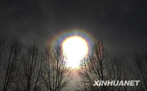 12月20日,西藏拉薩上空出現(xiàn)日暈,太陽周圍有一圈美麗的光環(huán),引得路人紛紛駐足觀看。