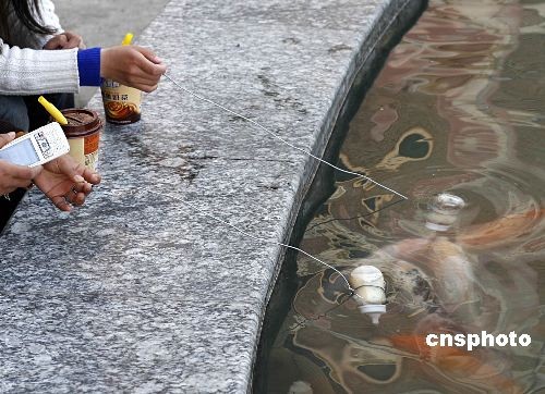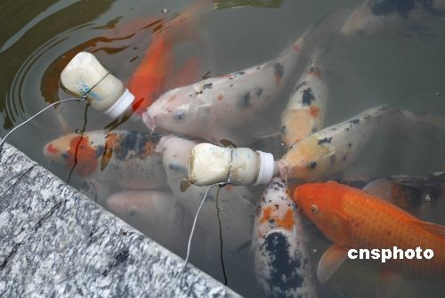 3月中旬,工作人員喂養(yǎng)“喝奶”的魚。在浙江東陽橫店影視城香港街景點(diǎn)內(nèi),養(yǎng)在水壇中的觀賞錦鯉是普通錦鯉與日本某錦鯉雜交后培育的品種,喂養(yǎng)它們則需要將飼料裝灌進(jìn)嬰幼兒奶瓶中,該飼料的顏色如“乳奶”一般,然后將奶瓶用鐵絲系住放入水中,隨后,這些魚兒就會(huì)圍攏過來,爭(zhēng)搶著用奶嘴吸“奶”喝了。