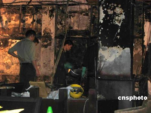 廣東東莞市樟木頭鎮(zhèn)怡安街名典西餐廳十二月十二日晚發(fā)生火災,現場死傷十九人,其中死亡十人,重傷一人,輕傷八人,至深夜重傷者也不治身亡。樟木頭素有小香港之稱,境外人士眾多,火災發(fā)生后坊間曾傳聞死者中有外國人,十三日從樟木頭鎮(zhèn)政府得到證實,火災死傷者皆為中國內地人士,并無境外人士。圖為火災撲滅后的名典西餐廳內一片狼藉,消防隊員在現場進行勘查。中新社發(fā) 李映民 攝