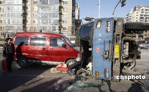 十二月十五日,北京天通苑小區(qū)門前道路,一輛拉載水泥板的大型貨車在路口拐彎時側(cè)翻,造成交通堵塞。中新社發(fā) 廖文靜 攝