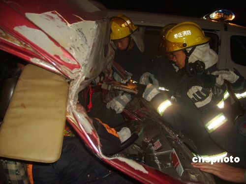 12月24日,山東棗莊發(fā)生一起兩車追尾事故。當?shù)叵乐ш犔厍谥嘘牻拥綀缶,派?2名消防官兵、一輛搶險救援車和一輛水罐車。經(jīng)過近半個小時施救,2名被困人員成功獲救。中新社發(fā) 季龍 攝