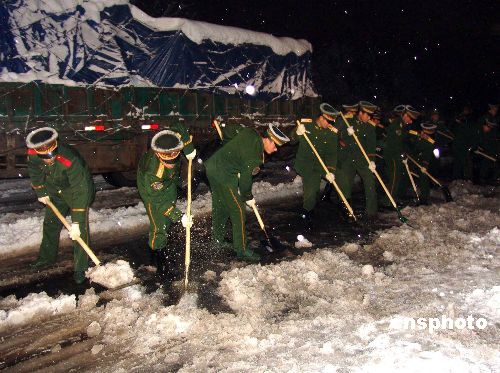 1月28日下午16時,武警江蘇總隊1500余名官兵緊急奔赴南京長江二橋除雪抗災(zāi)。南京長江二橋是南北交通大動脈,更是向南京市區(qū)運(yùn)輸新鮮農(nóng)產(chǎn)品的主要通道,每天車流量達(dá)到5萬余次。暴雪已使二橋交通中斷,近兩千車輛被迫停泊在風(fēng)雪中。截至1月29日凌晨2時許,經(jīng)過武警官兵連續(xù)10多個小時的艱苦奮戰(zhàn),約30公里的高速公路重新暢通。 中新社發(fā) 唐占軍 攝