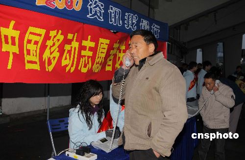 近期受連續(xù)雨雪和凍雨天氣影響,大批旅客滯留廣州及韶關(guān)等地。廣州移動(dòng)啟動(dòng)現(xiàn)場(chǎng)應(yīng)急通信保障,向滯留旅客提供免費(fèi)電話服務(wù),向家人報(bào)平安。同時(shí)發(fā)送定向短信,第一時(shí)間通報(bào)春運(yùn)動(dòng)態(tài)。中新社發(fā) 譚穎 攝