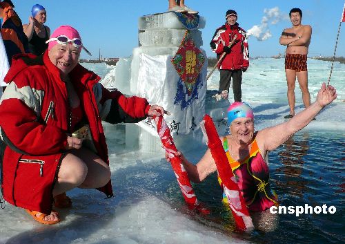 1月31日,黑龍江黑河30余名冬泳健兒與9名俄羅斯女冬泳運(yùn)動員在中俄界江冒著零下30度嚴(yán)寒開展冬泳聯(lián)誼活動。據(jù)悉,89歲冬泳健將尼娜·加里寧娜曾經(jīng)參加過俄羅斯納霍德卡市衛(wèi)國戰(zhàn)爭。中新社發(fā) 邱齊龍 攝
