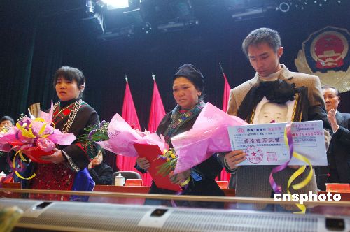 2月4日,貴州省委、省政府召開電視電話會議,表彰抗雪災(zāi)犧牲在崗位上的民警歐光權(quán)。歐光權(quán)是貴州省臺江縣看守所民警,在抗雪災(zāi)一線超負(fù)荷工作,1月21日因積勞成疾突發(fā)腦溢血倒在崗位上,經(jīng)搶救無效光榮犧牲,終年57歲。2月2日,公安部部長孟建柱簽署命令,追授歐光權(quán)為全國公安二級英模。表彰會上有關(guān)領(lǐng)導(dǎo)一次性向歐光權(quán)的家屬頒發(fā)獎金21萬元。中新社發(fā) 吳東俊 攝