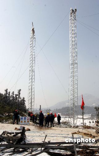 一座塔倒下去,又一座塔立起來,湖南望城縣橋驛鎮(zhèn)月塘村華沙線500千伏塔,電力工人羅海文、羅長明、周景華不幸遇難的送變電倒塌電塔現(xiàn)場,經(jīng)過湖南省送變電建設(shè)有限公司三分公司140多職工和120名武警官兵日夜搶修,2月3日,在原41號鐵塔的廢墟上立起了一座新塔。另外44、43號倒塌的鐵塔也在近日修復。中新社發(fā) 殷中民 攝