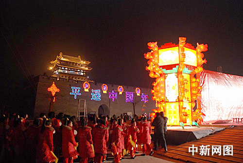 節(jié)日里的平遙古城流光溢彩,燈彩迷人,各色燈組為當(dāng)?shù)鼐用窈椭型庥慰蛶砹藦?qiáng)烈的視覺沖擊和心靈震撼。裴旭亮 攝