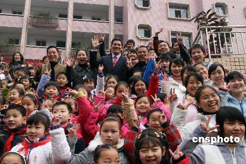 2月27日,英國外交大臣戴維·米利班德與農民工子女合影留念。戴維·米利班德一行于26日抵達重慶開始為期兩天的訪問,這是他上任以來首次訪華。中新社發(fā) 郭晉嘉 攝