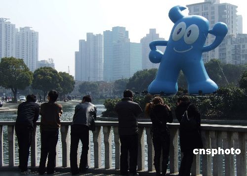 上海世博會(huì)吉祥物“海寶”現(xiàn)身新天地以來,吸引了許多中外游客。2月28日,聳立在太平湖面上的大個(gè)子海寶,成為城市一景。中新社發(fā) 蔣振雄