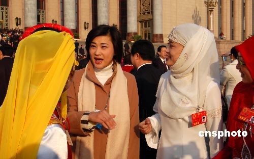 3月5日,十一屆全國人大一次會議在北京人民大會堂開幕。香港鳳凰衛(wèi)視名主播吳小莉(左二),會前在大會堂前采訪少數(shù)民族代表。中新社發(fā) 劉萬強(qiáng) 攝
