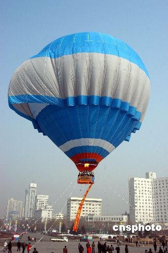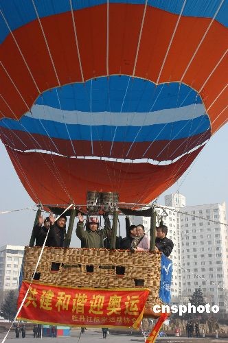 3月12日,黑龍江省牡丹江市航空協(xié)會(huì)舉辦的迎奧運(yùn)熱氣球升空活動(dòng)在江濱廣場(chǎng)舉行。一只體積達(dá)8000立方米、載荷2.2噸、亞洲最大的熱氣球在廣場(chǎng)升起,“共建和諧奧運(yùn)”的條幅代表了航空愛好者的心聲。此次活動(dòng)吸引了許多市民前來觀看。中新社發(fā) 張克非 攝